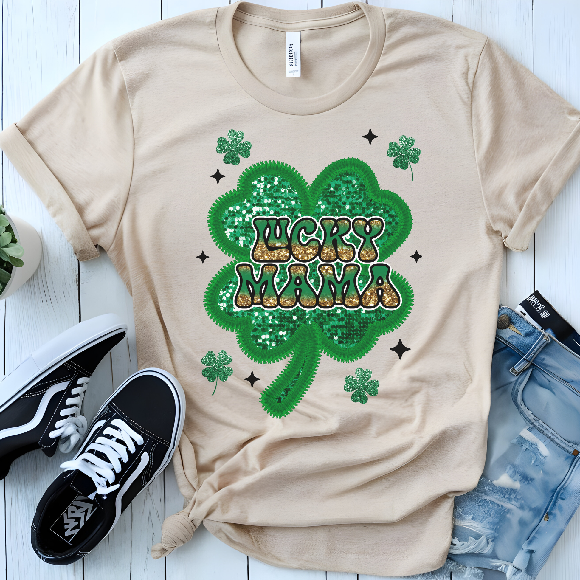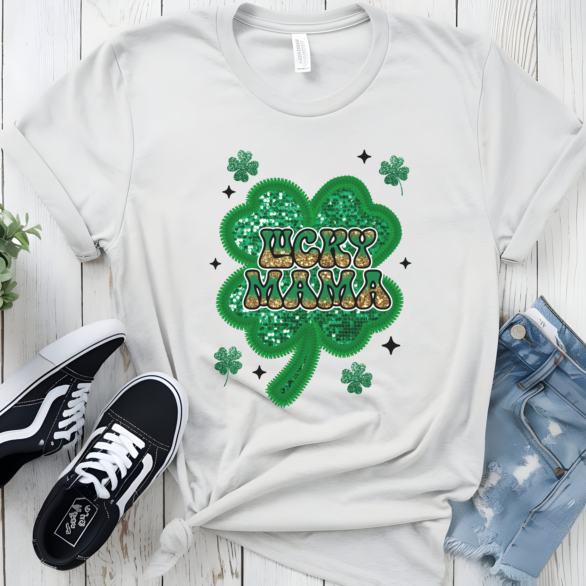 Celebrate your luckiest role yet! Get ready for the parade, the school party, or a casual coffee run with our "Lucky Mama" graphic tee. Featuring a vibrant, oversized four-leaf clover with a high-definition faux sequin and glitter effect, this shirt gives you all the sparkle of a holiday outfit without the scratchy texture of actual sequins.